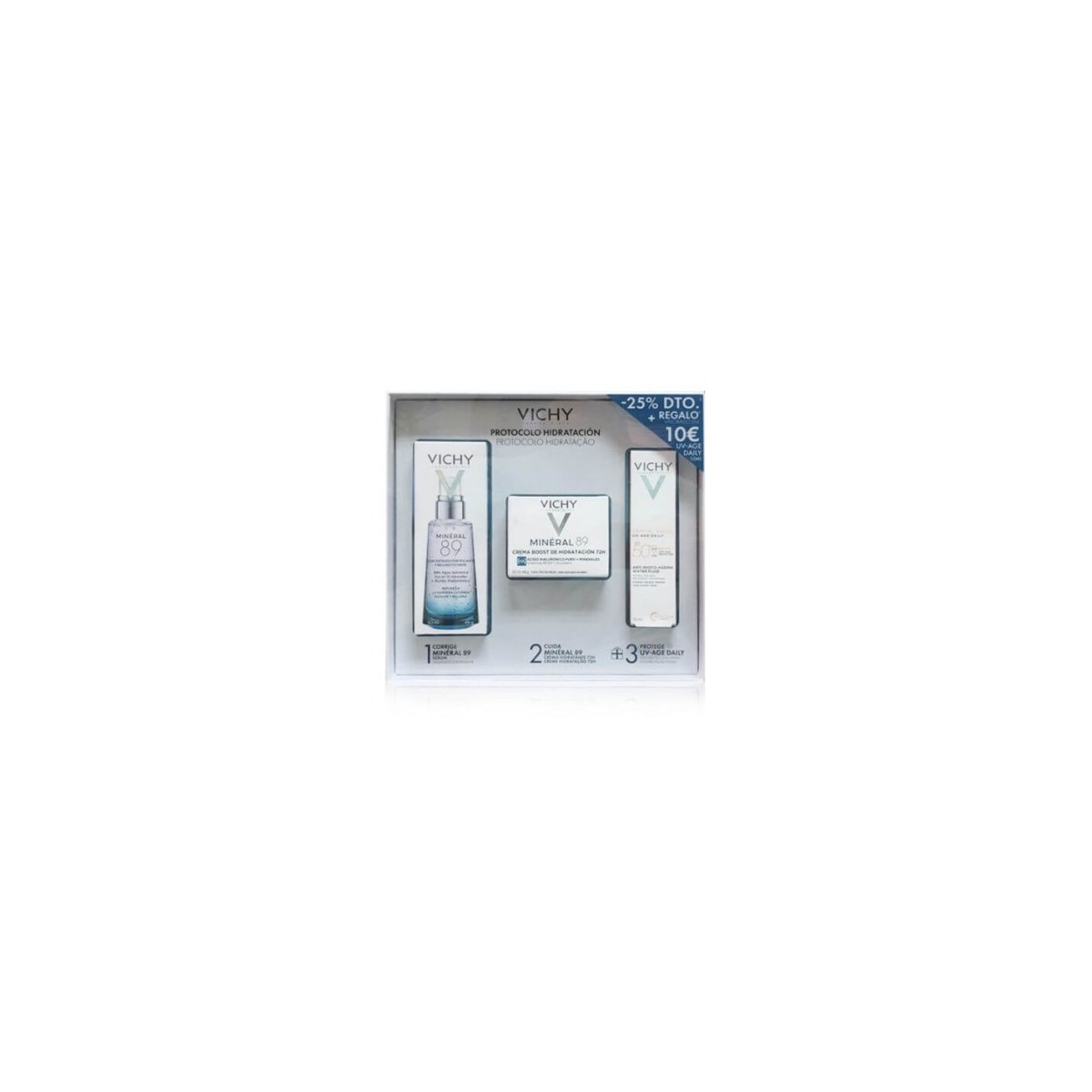 Protocolo hidratación Mineral 89. Contiene: Serum Mineral 89 de 50ml y Crema hidratante 72h Mineral 89 + Regalo: Fotoprotección SPF50+ UV-Age Daily de 15 ml.