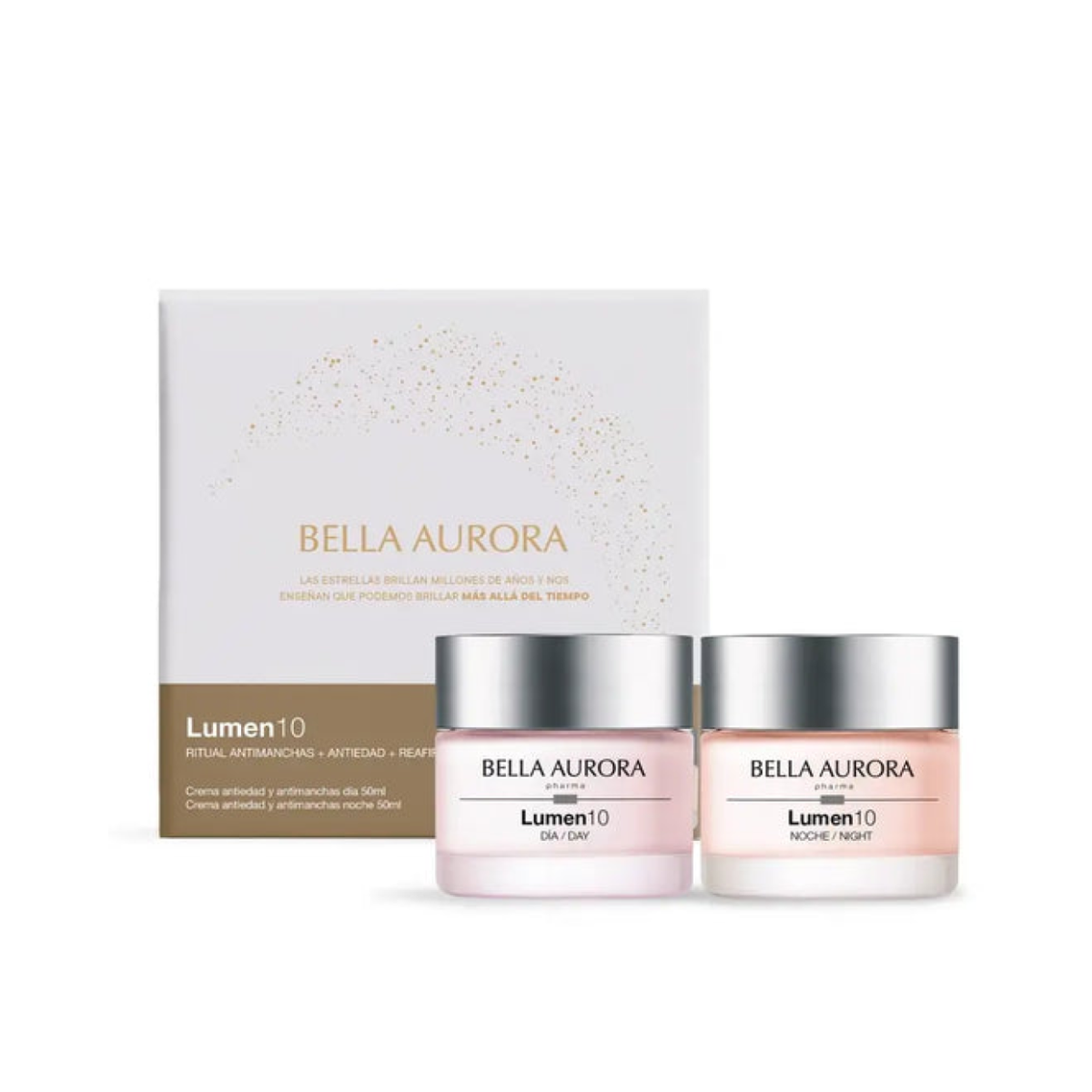 El pack Bella Aurora Lumen10 incluye una crema de día y otra de noche, formuladas para reducir manchas, combatir el envejecimiento y mejorar la firmeza de la piel. Proporcionan hidratación continua y luminosidad.